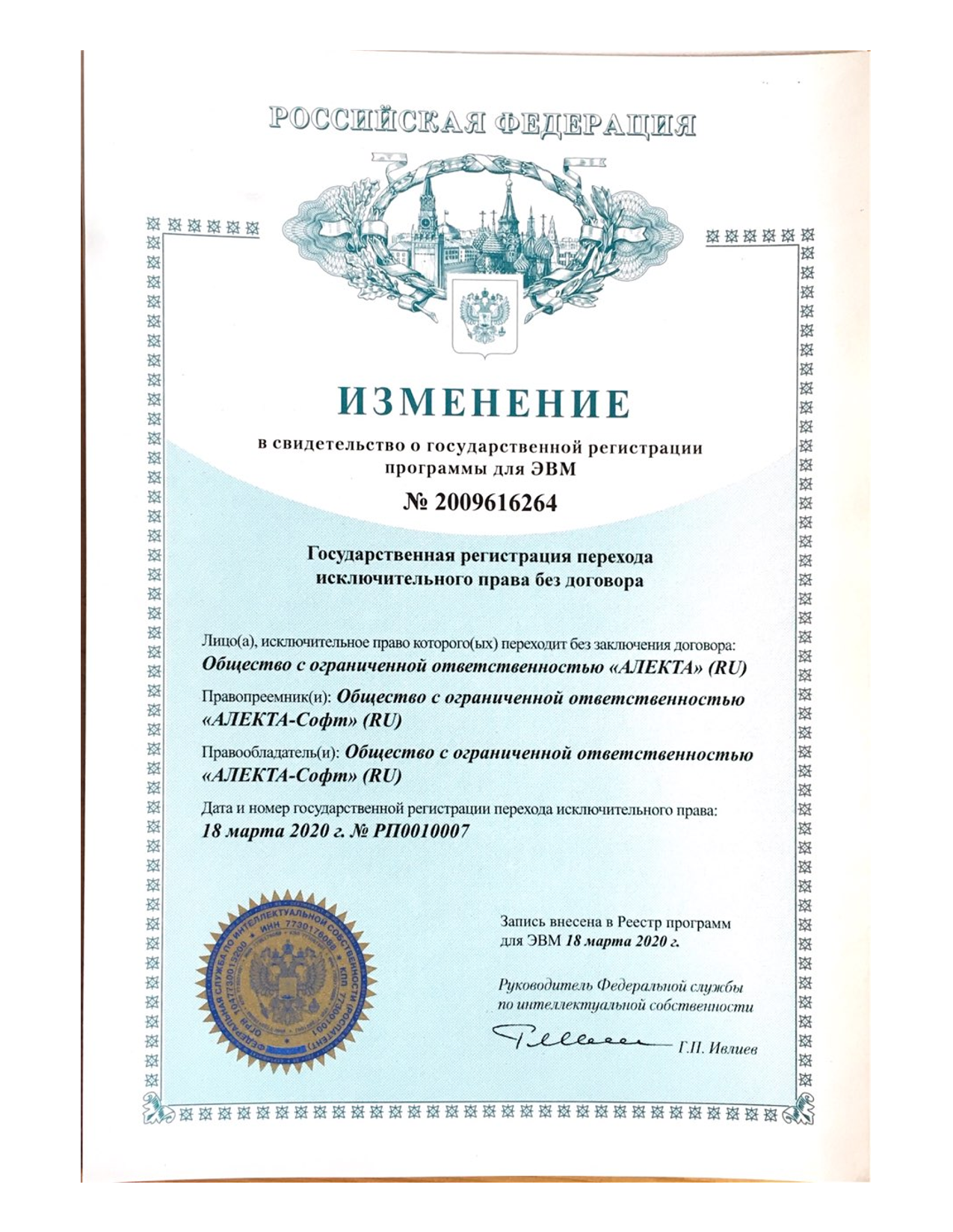 Изменение №РП0010007 от 18.03.2020 в свидетельство о государственной регистрации программы для ЭВМ № 2009616264 от 12.11.2009 о переходе исключительного права