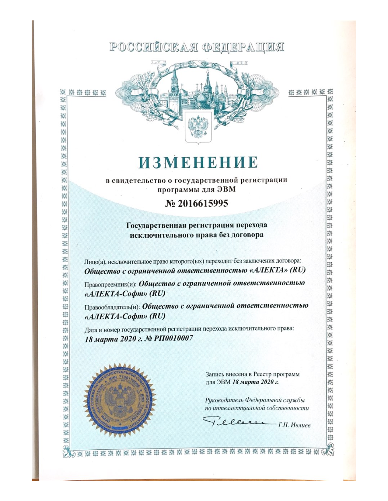Изменение №РП0010007 от 18.03.2020 в свидетельство о государственной регистрации программы для ЭВМ № 2016615995 от 02.06.2016 о переходе исключительного права